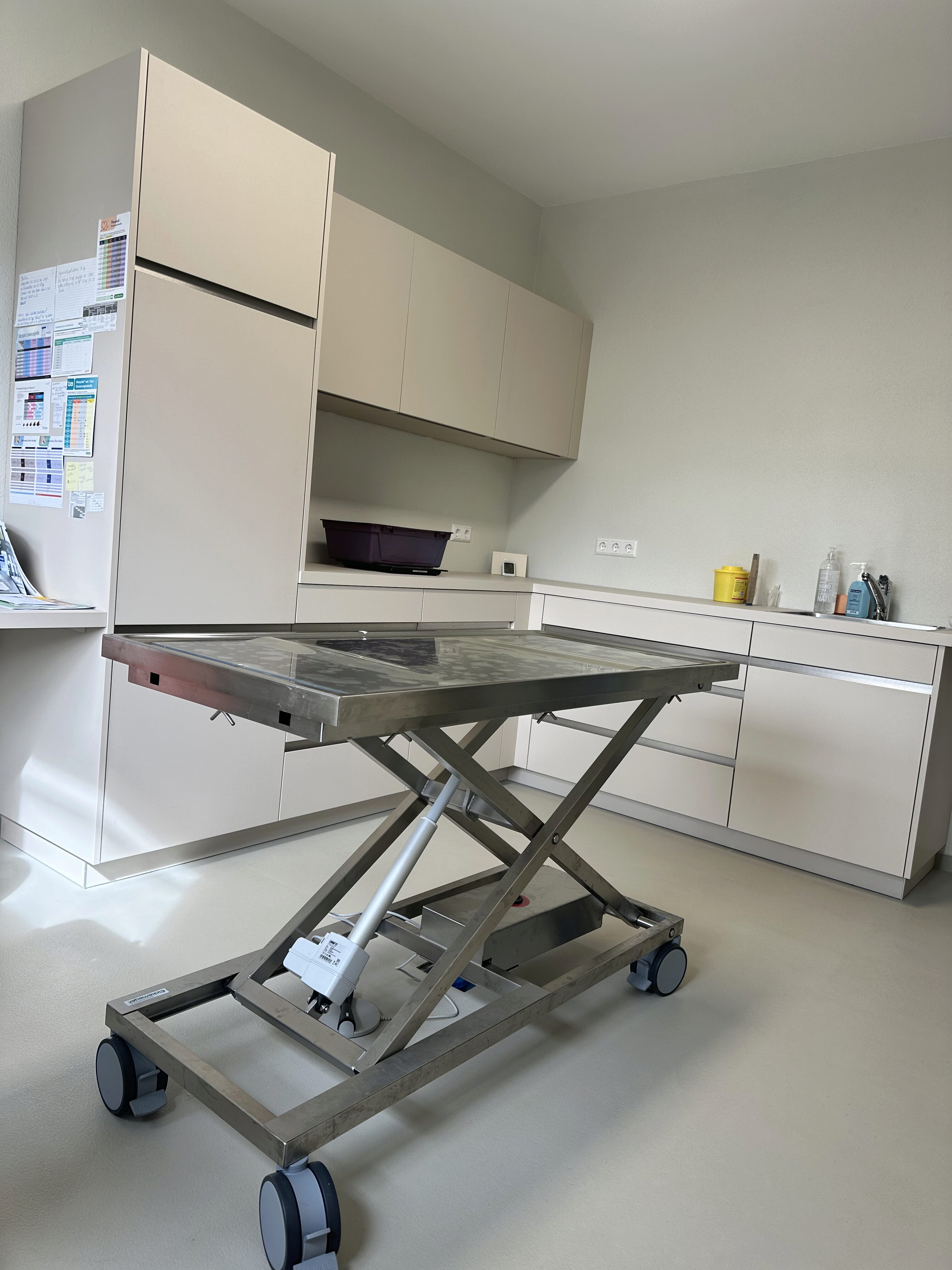 Derzeit haben wir einen internistischen Schwerpunkt und freuen uns, unsere Chirurgie mit neuen Teammitgliedern weiter auszubauen. Mit einer Größe von ca. 190 m² bieten wir genügend Platz für einen möglichst reibungslosen Arbeitsalltag: Ein großzügiger Empfangs- und Wartebereich, drei Behandlungszimmer, OP, Labor, Station, Ultraschallraum, Röntgenbereich und zwei Räume für Patienten und deren Besitzer:innen zur Infusion/Euthanasie, Aufwachen nach der Narkose etc.